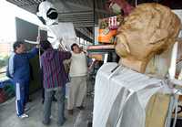 Trabajadores del Faro de Oriente alistan las mojigangas que serán utilizadas durante el desfile por el 96 aniversario del comienzo de la Revolución Mexicana