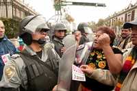 Elementos de la Secretaría de Seguridad Pública trataron de replegar a los manifestantes oaxaqueños que llegaron a las instalaciones de la Secretaría de Gobernación