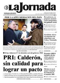 Representantes de la Asamblea Popular de los Pueblos de Oaxaca se reunieron ayer en privado, por tres horas, con el nuncio apostólico Giuseppe Bertello quien aparece en la foto con Flavio Sosa, uno de los líderes de la resistencia, a quien entregaron una carta dirigida a Benedicto XVI, en la cual explican cuál es la situación en el estado, le piden que llame a la paz y respalde su demanda sobre la remoción del gobernador Ulises Ruiz. En la capital del estado, mientras tanto, una brigada móvil del movimiento opositor tomó la estación Radio Mexicana para transmitir un mensaje en el que exige la salida inmediata de la Policía Federal Preventiva FOTO María Meléndrez Parada