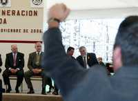El director de Luz y Fuerza del Centro, Luis de Pablo Serna; el titular de la Secretaría de Energía, Fernando Canales Clariond; Alejandro Encinas, jefe del Gobierno del Distrito Federal, y el mandatario mexiquense, Enrique Peña Nieto, durante la inauguración, en San Mateo Atenco, de una planta generadora de energía eléctrica. Durante el acto, trabajadores del SME expresaron consignas contra la privatización de la industria eléctrica