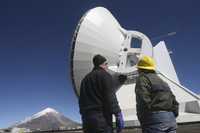 Trabajadores observan el Gran Telescopio Milimétrico, que se encuentra en la cima del volcán Sierra Negra. La antena parabólica permitirá captar las radiaciones que llegan de las zonas más profundas del espacio