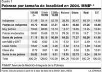 El primer resultado que llama la atención es el nivel tan alto de la pobreza en el país1: 81.3 por ciento de la población es pobre y 39.1 por ciento indigente a nivel nacional, proporciones que derivan de las medias ponderadas entre el medio rural (localidades de menos de 2 mil 500 habitantes): 94 por ciento en pobreza y 66.7 por ciento en indigencia, y el urbano: 77.3 por ciento y 30.5 por ciento, respectivamente. Tanto la incidencia de la pobreza como de la indigencia van bajando a medida que ascendemos en la escala de tamaños de localidades urbanas: 91 por ciento y 53.8 por ciento en las localidades de 2 mil 500 a menos de 15 mil habitantes; 85.2 por ciento y 39.4 por ciento en las de 15 mil a menos de 100 mil, y 71.2 por ciento y 21.55 en las mayores de 100 mil. En el DF estas incidencias son todavía menores: 61.9 y 15 por ciento.