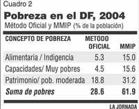 Al comparar los resultados para los tres estratos de pobreza de cada método en el DF (Cuadro 2) se pone en evidencia la radical subestimación de la pobreza del método oficial: su pobreza alimentaria comprende sólo a 5 por ciento de la población del DF, la tercera parte de los indigentes identificados con el MMIP; algo similar ocurre cuando se comparan los pobres de capacidades con los muy pobres del MMIP, mientras la pobreza de patrimonio es apenas poco más de la mitad de la pobreza moderada. En términos de la pobreza en su conjunto, el método oficial identifica menos de 30 por ciento de población en esa condición en el DF, mientras el MMIP identifica como tal a más de 60 por ciento de sus habitantes, más del doble. La suma de la población indigente y muy pobre del MMIP, a la cual he llamado pobreza extrema, supera en dos puntos porcentuales toda la pobreza oficial, haciendo evidente que el método oficial identifica lo que la doctrina neoliberal postula como la única población que requiere apoyo: la que vive en pobreza extrema.