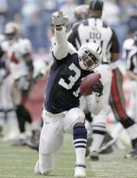 El jugador 31 de Vaqueros de Dallas celebra su intercepción a Bucaneros de Tampa, en el primer cuarto