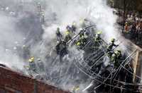 Bomberos trabajan para sofocar el incendio en una fábrica de alfombras ubicada en la calle de Dakota esquina con calzada de Tlalpan, en la colonia Parque San Andrés, a unas cuadras del Metro General Anaya