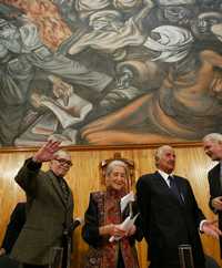 Nadine Gordimer, ayer, acompañada por Gabriel García Márquez y Carlos Fuentes, al concluir su participación en el Paraninfo de la Universidad de Guadalajara