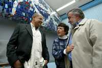 El artista plástico Alberto Castro Leñero, la secretaria de Cultura, Raquel Sosa, y el jefe de Gobierno, Alejandro Encinas, durante la inauguración de los murales Elementos, en la estación Tasqueña del Metro