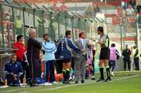 Mientras Américo Gallego (izquierda) observa las acciones del partido, Miguel Herrera reclama en su área técnica