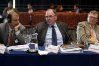 Ampliar la imagen Desde la izquierda, los representantes del Fondo Monetario Interncional, Rashad Kaldan; de Petroamérica, Adrián Lajous, y de la Universidad Harvard, James Robinson, ayer en la conferencia internacional sobre equidad y competencia en México Foto: Cristina Rodríguez