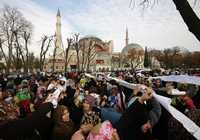 Protesta contra la presencia del Papa frente al recinto de Santa Sofía, ex basílica bizantina convertida en museo que Benedicto XVI visitará este jueves como parte de su gira por Turquía