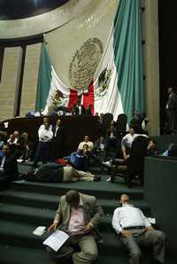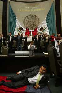 Panistas y perredistas permanecían anoche en la tribuna de la Cámara de Diputados. Ambos grupos aseguran que permanecerán ahí hasta el primero de diciembre