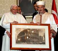 Benedicto XVI recibe un regalo de Ali Bardakoglu, jefe de asuntos religiosos de Turquía