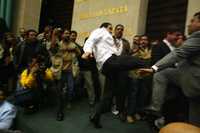 El enfrentamiento ocurrido ayer en la tribuna del Palacio Legislativo de San Lázaro entre diputados de los partidos Acción Nacional (PAN) y de la Revolución Democrática (PRD), cuando los primeros tomaron la tribuna y agredieron a los perredistas, fue censurado por políticos y académicos. Pero en el blanquiazul la interpretación fue completamente distinta, y ese partido responsabilizó del altercado a los legisladores del sol azteca.