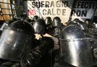 Equipo antimotines depositado en el piso en las inmediaciones del Palacio Legislativo de San Lázaro, en la víspera de la ceremonia en que Felipe Calderón Hinojosa debe rendir protesta como presidente ante el Congreso de la Unión