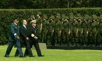 Escoltado por el general Guillermo Galván Galván, secretario de Defensa, y por el titular de la Armada, almirante Mariano Francisco Saynez Mendoza, el presidente Felipe Calderón pasa revista a cuerpos de las fuerzas armadas en el Campo Marte