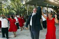 El mandatario local, Alejandro Encinas, baila una pieza de danzón tras reinaugurar el Jardín de la Tercera Edad, en el Bosque de Chapultepec