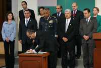 En su primer acto en el salón Adolfo López Mateos de la residencia oficial de Los Pinos, Calderón y los 20 integrantes del gabinete legal firmaron el decreto de austeridad, del cual quedan exentas las áreas de seguridad pública y de procuración de justicia.