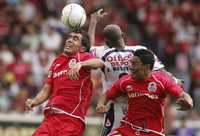 El defensa colombiano Aquivaldo Mosquera se sumó al ataque, pero Edgar Dueñas (derecha) y José Cruzalta controlaron sus intentos