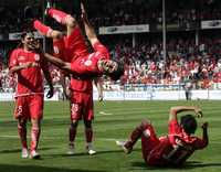 Ampliar la imagen Bruno Marioni (izquierda) y Vicente Sánchez celebran el gol del uruguayo ante Tuzos Foto: Reuters