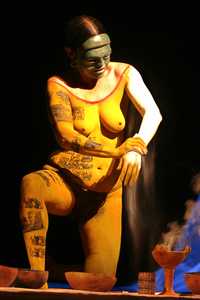 Basada en gran parte en lo que fue llamado una "estética mesoamericana", y con algunas partes habladas en náhuatl, amén de buenas dosis de humor y acidez, la puesta que dirige y actúa Jesusa y en la que Liliana Felipe canta y toca el piano, se presentó la noche del sábado en el Teatro de la Ciudad, el cual se llenó en su primer y segundo nivel.