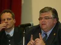 El secretario de Hacienda, Agustín Carstens, durante el anuncio del programa económico 2007. Lo acompaña Alejandro Werner