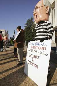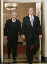 El presidente George W. Bush (derecha), sale del Salón Diplomático de la Casa Blanca en compañía de Robert Gates, nominado a ocupar la secretaría de Defensa estadunidense, cargo en el que aún debe ser ratificado por el Senado. A la derecha, imagen de una protesta frente al Capitolio en rechazo a esta designación con un cartel en el que califican de corrupto al virtual sucesor de Donald Rumsfeld