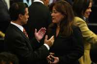 El gobernador del estado de México, Enrique Peña Nieto, conversa con la senadora del PRD Yeidckol Polevnsky, ayer durante la rendición de protesta de Marcelo Ebrard Casaubon como jefe de Gobierno del Distrito Federal