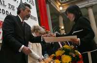 Rosa Elvira Vargas recibe de manos del director del IPN, Enrique Villa, los reconocimientos otorgados a La Jornada