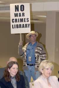 Un hombre protesta contra la guerra durante una lectura en la biblioteca presidencial en Waco, Texas