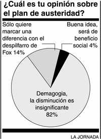 El decreto del presidente Calderón que establece una disminución de 10 por ciento de su sueldo, así como el de un pequeño grupo de sus colaboradores, es un gesto demagógico, en opinión de 82 por ciento de 3 mil 138 ciudadanos cuya opinión sondeamos esta semana. La reducción es demasiado pequeña para que tenga un efecto significativo. Un 14 por ciento piensa que es un gesto para marcar una diferencia con el gobierno anterior, que se caracterizó por el derroche de la familia presidencial. Y cuatro por ciento opina que es buena idea y dejará un beneficio a la sociedad.