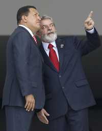 Los presidentes de Venezuela, Hugo Chávez, y de Brasil, Luiz Inacio Lula da Silva, durante su encuentro ayer en la capital brasileña