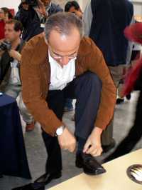 "De una vez nos ponemos el par, ¿no?", exclamó emocionado el panista, pero luego se dio cuenta que los zapatos le quedaban grandes. "Tengo que probarme el seis", expresó un poco apenado, pero al final no se los quitó y entregó los suyos a un ayudante del Estado Mayor Presidencial.
