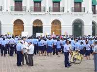 Trabajadores sindicalizados de la Universidad Juárez Autónoma de Tabasco se manifestaron en la plaza de armas de Villahermosa para exigir el bono sexenal
