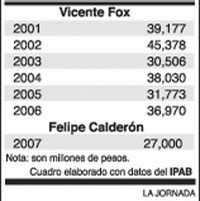 En el primer presupuesto que propone Felipe Calderón al Congreso ­el del año próximo­ se asignan más recursos a la corrupción ­el Fobaproa/IPAB­ que a la UNAM. Es la continuación del saqueo del foxismo. Aparentemente Calderón ha comenzado a pagar la deuda que contrajo con los grandes empresarios del país ­algunos de ellos son beneficiarios del Fobaproa­ por la campaña de terror que instrumentaron para fortalecer su candidatura. El nuevo gobierno propone que se asignen 27 mil millones de pesos al fraude bancario, mientras que a la UNAM pretende restarle 900 millones. En la práctica estaría quitando dinero a la comunidad universitaria para dárselo a los defraudadores del llamado rescate bancario. En la gráfica puede verse el dinero que su antecesor, don Vicente exSpot, con la aprobación de legisladores del PAN y el PRI, sustrajo del presupuesto, año por año. Hizo posible que la banca y grandes empresarios obtuvieran una ganancia cuestionable. Calderón propone para el año próximo una suma que en apariencia es menor, 27 mil millones, mas no es así, ya que Fox anticipó pagos por casi 40 mil millones de pesos antes de irse.