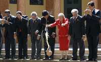 Los líderes de América del Sur posan para la foto oficial, luego de beber chicha en honor de la madre Tierra y romper el cántaro que la contenía