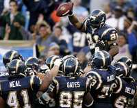 San Diego, 10 de diciembre. La figura de San Diego, LaDainian Tomlinson implantó nueva marca de todos los tiempos en la NFL al conseguir 29 anotaciones en una temporada y dejó atrás la de 28 que pertenecía a Shaun Alexander, en el triunfo de Cargadores de San Diego 48-20 sobre Broncos de Denver.
