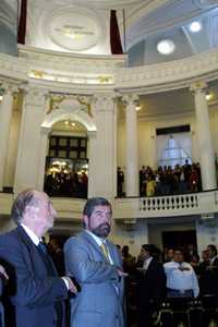 Pablo González Casanova y el rector Juan Ramón de la Fuente, durante la sesión en la Asamblea Legislativa