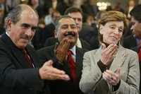 Los senadores del PRD, Pablo Gómez, y del PRI, Manlio Fabio Beltrones y Rosario Green, saludan al nuevo secretario de la mesa directiva, durante la sesión de ayer en la cámara alta