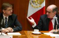 Luis Téllez, secretario de Comunicaciones y Transportes, y Rafael del Villar, subsecretario de Comunicaciones, ayer en conferencia de prensa sobre licitaciones para televisión