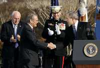 Donald Rumsfeld, saliente secretario de la Defensa de Estados Unidos, es felicitado por el presidente George W. Bush durante la ceremonia de despedida del primero, realizada en el Pentágono. Atrás, el vicepresidente Dick Cheney y el general Peter Pace, jefe del estado mayor del ejército estadunidense