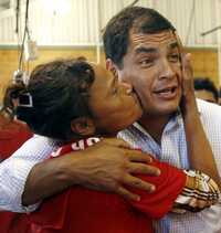 El presidente electo ecuatoriano, Rafael Correa, saluda a una trabajadora venezolana durante su visita a una cooperativa financiada con fondos petroleros