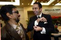 El secretario del Trabajo, Javier Lozano, muestra sus mancuernillas al líder de los ferrocarrileros, Víctor Flores Morales, quien saludó al funcionario con un "mi jefe de jefes"
