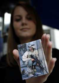 Jaclyn Sharratt muestra una foto de su hermano Justin Sharratt, militar estadunidense acusado de asesinar a civiles iraquíes en Haditha, en noviembre del año pasado