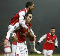 Robin Van y Theo Waltcott (arriba), del Arsenal, festejan la anotación del primero al Watford en la liga inglesa
