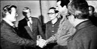Ampliar la imagen Imagen de video de Donald Rumsfeld y el entonces presidente tomada el 20 de diciembre de 1983, cuando el líder iraquí era el mandatario consentido del gobierno de Estados Unidos