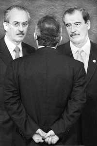 Ampliar la imagen Francisco Gil Díaz, Felipe Calderón (de espalda) y Vicente Fox Foto: José Antonio López