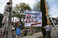 Empleados de la dirigencia estatal panista, colocan una manta en uno de los sitios donde presuntamente fueron arrancadas varias más, en las que el PAN rechaza la deuda que adquirirá el gobierno estatal, encabezado por el también panista Luis Reynoso Femat