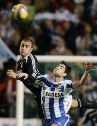 Angel Arizmendi (derecha), del Deportivo La Coruña, salta por el balón junto con el defensa merengue Fabio Cannavaro