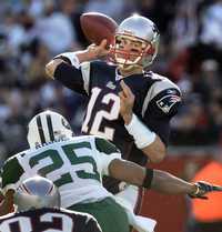 Tom Brady, quarterback de Nueva Inglaterra, lanza el ovoide ante la presión de Kerry Rhodes (25)