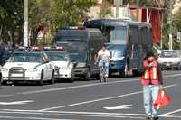 Policías de la SSP-DF mantienen vigilancia permanente en el cruce del Eje 3 Oriente y la Calzada de la Virgen, para evitar que vecinos de la zona que se oponen a la construcción del distribuidor vial impidan los trabajos